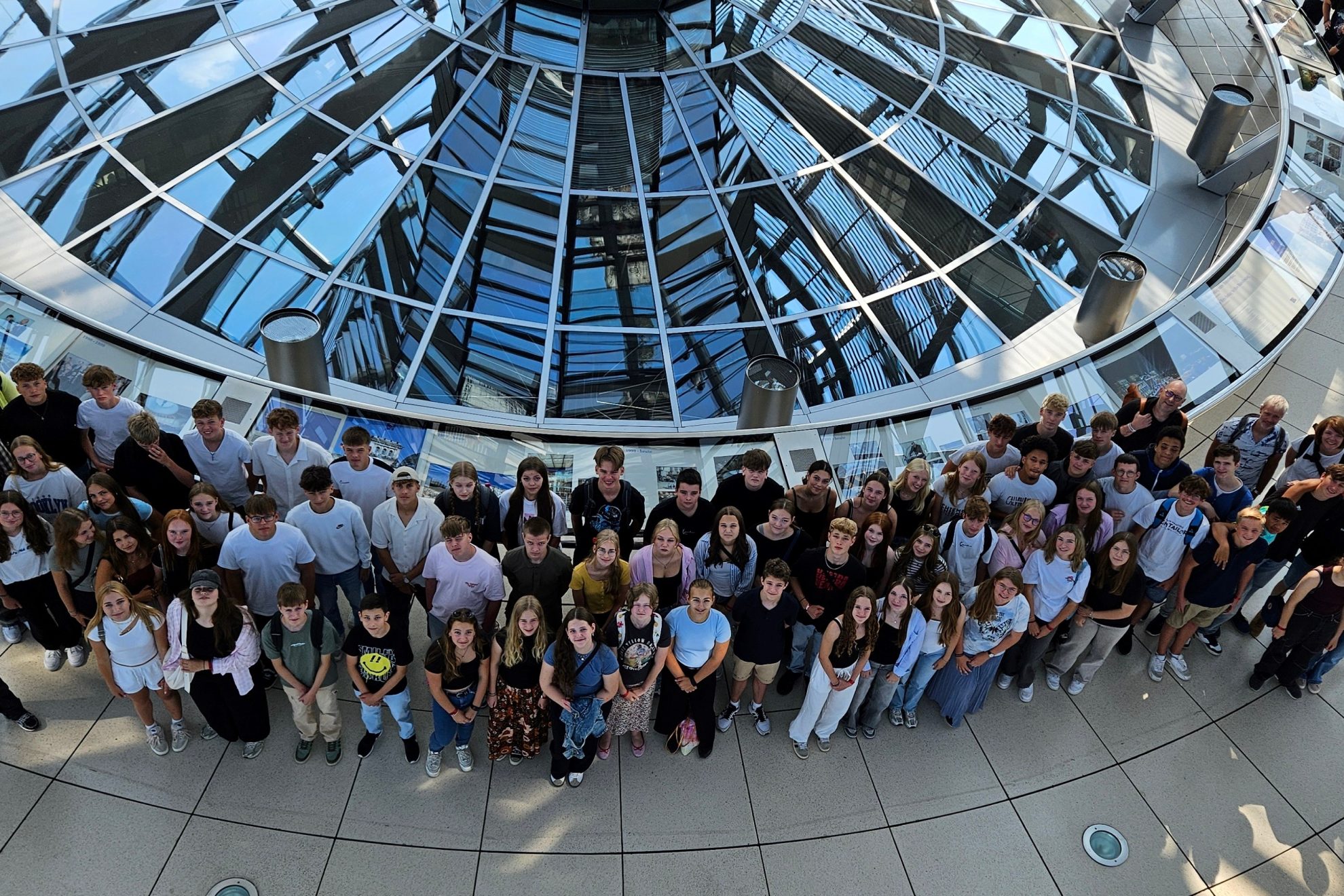 Im Rahmen ihrer Berlin-Fahrt statteten die Klassen auch dem Parlament einen Besuch ab. Zunächst erfuhr die Gruppe bei einem Vortrag im Plenarsaal viel über die Arbeit des Parlamentes, die Gewaltenteilung und die bewegte Geschichte des Reichstagsgebäudes. Danach trafen die Schülerinnen und Schüler mit ihren Lehrkräften einen Mitarbeiter Johann Saathoffs zu einem Gespräch. In einem lebhaften Austausch ging es zunächst um den Arbeitsalltag eines Abgeordneten und seiner Mitarbeiter. Ob Demokratie, Zuwanderung oder das Freibad Borssum, es gab viel zu besprechen. Bei bestem Wetter machte die Gruppe dann zum Abschluss vor Kuppel auf dem Reichstag noch ein Foto, bevor sie sich auf den Weg ins ehemalige Stasi-Gefängnis in Berlin-Hohenschönhausen machte.