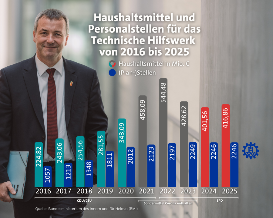 Sowohl bei der finanziellen Ausstattung wie auch beim Personal steht das THW heute viel besser da als zu Zeiten Horst Seehofers. Gut 400 Millionen Euro und 2.246 Stellen bedeuten in 2024 fast eine Verdoppelung der Zahlen von 2016. Darüber können auch Corona-Sondermittel nicht hinwegtäuschen.